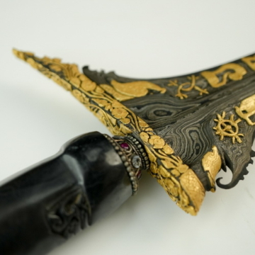 Keris ini dibuat dengan konsep pusaka bangsawan: bilah elegan, hiasan mewah, dan karakter yang menunjukkan kehalusan cita rasa pemiliknya. Kinatah emas pada bagian tertentu bilah menjadikan pusaka ini bukan hanya berharga secara seni, tetapi juga bernilai tinggi bagi kolektor yang memahami keistimewaan pengerjaan tradisional.