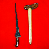 Rp 1.850.000Pusaka Keris Buntel Mayit. Dapur / Bentuk : Balebang. Pamor / Lambang / Filosofi : Buntel Mayit. Tangguh / Era Pembuatan / Estimasi : Kamardikan Model Bilah Pusaka : Keris Luk 7. Panjang Bilang-Gonjo Keris : 37,7 CM Panjang Seluruh Keris : 45 CM Asal Usul Pusaka : Dari Mpu Wesi Aji. Warangka Ladrang Surakarta,… selengkapnya